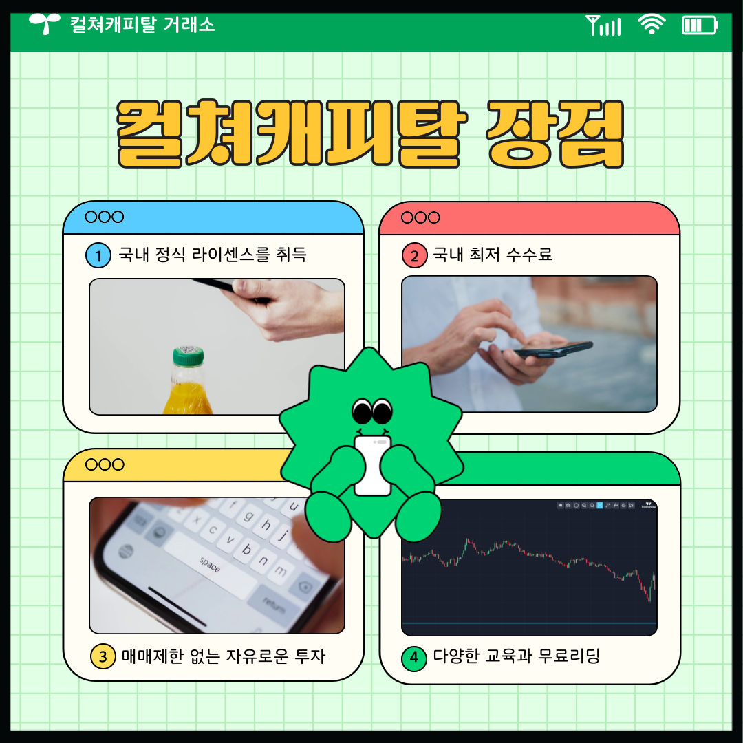 - 24시간 거래: 낮에도, 밤에도 거래 가능. 바쁜 직장인도 투자할 시간 확보.