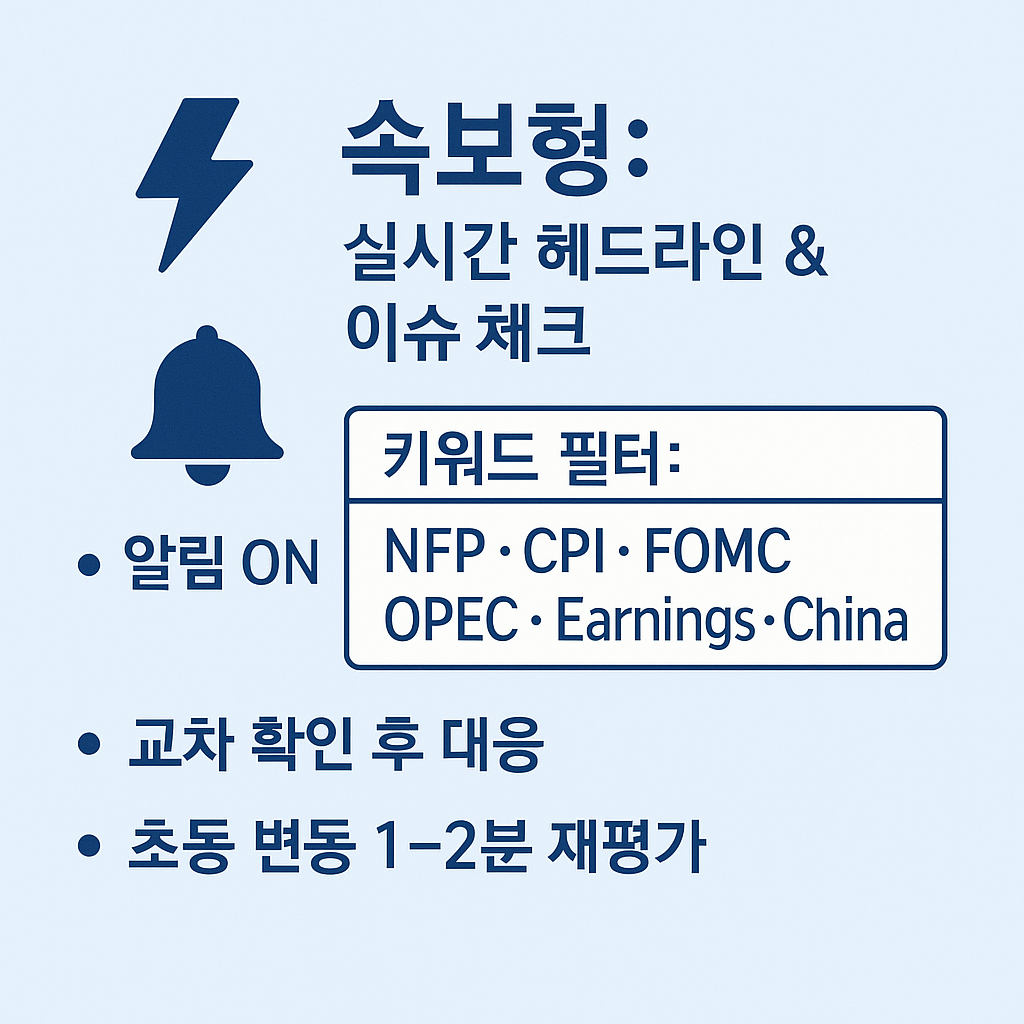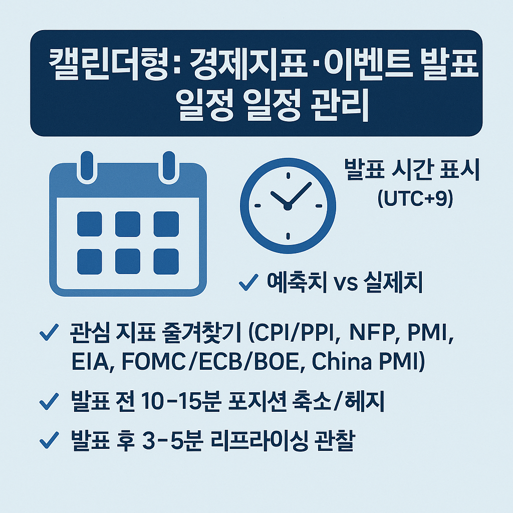 알림(푸시/브라우저)을 켜서 키워드 필터 설정 : NFP, CPI, FPMC, OPEC, Tech Earmings, China stimulus 헤드라인만 보고 즉시 진입 금지 → 초동 변동 → 1 ~ 2분 재평가 → 타점 설정 - 체크리스트