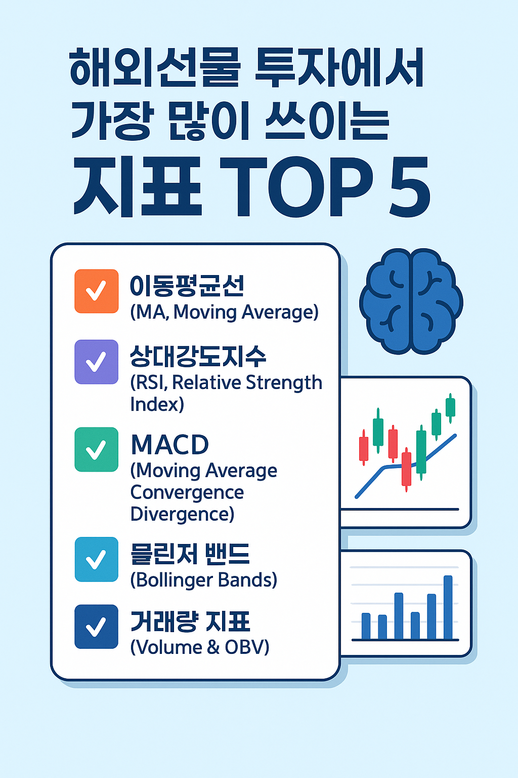 해외선물 투자에서 많이 쓰이는 지표 5가지는 MA, RSI, MACD, 볼린저밴드, 거래량입니다.