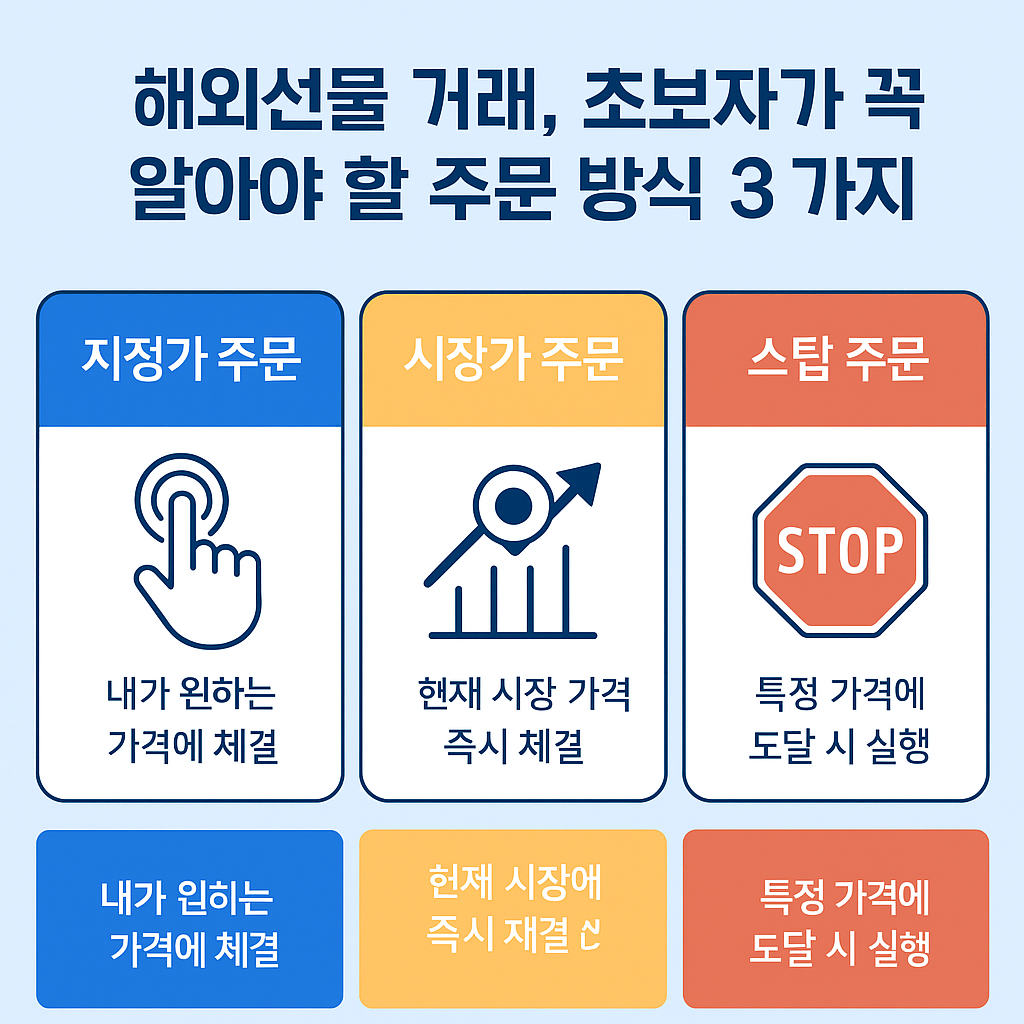 해외선물 거래에서 주문 방식은 수익과 손실을 좌우하는 중요한 요소입니다. 초보자가 반드시 알아야 할 지정가, 시장가, 스탑 주문의 차이를 쉽게 설명하고, 컬쳐캐피탈 플랫폼에서 활용하는 방법까지 정리했습니다.