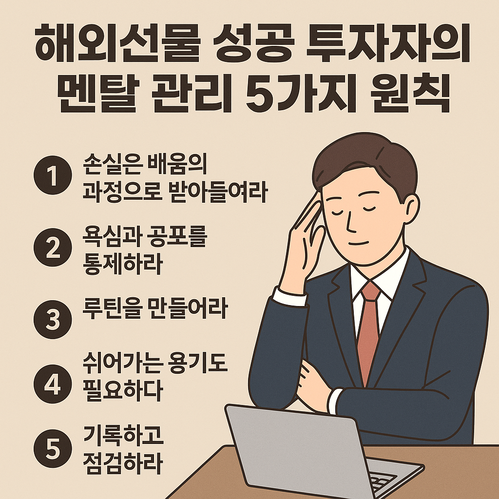 해외선물 투자에서 수익을 내는 사람들의 공통점은 뛰어난 멘탈 관리입니다. 손실을 극복하고 일관된 매매를 이어가기 위한 5가지 멘탈 원칙을 정리했습니다.