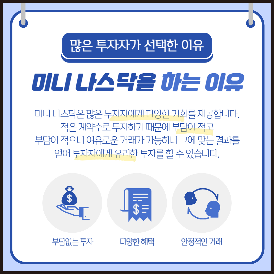 1. **낮은 초기 투자 비용**: 미니 나스닥은 소액으로 시작할 수 있어, 자본이 부족한 투자자들도 쉽게 접근할 수 있습니다. 이는 특히 투자에 대한 경험이 적은 초보자들에게 큰 장점입니다.