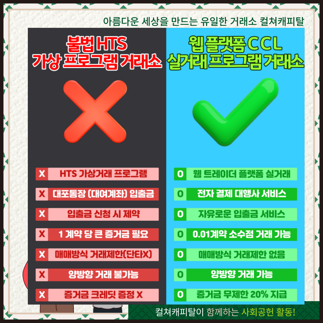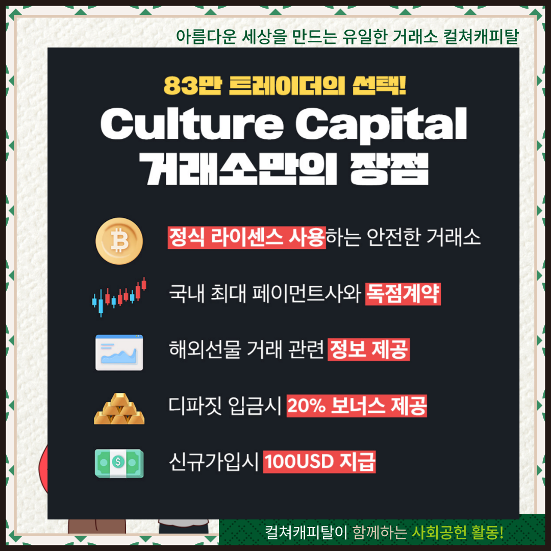컬쳐캐피탈은 단순한 투자 플랫폼을 넘어서, 사회적 책임을 다하는 기업이자, 안전하고 신뢰할 수 있는 거래소로 계속해서 성장하고 있습니다. 월드비전 후원과 파트너십 등록은 이러한 노력의 일환으로, 거래자들에게 더 큰 신뢰와 안전한 거래 환경을 제공합니다.